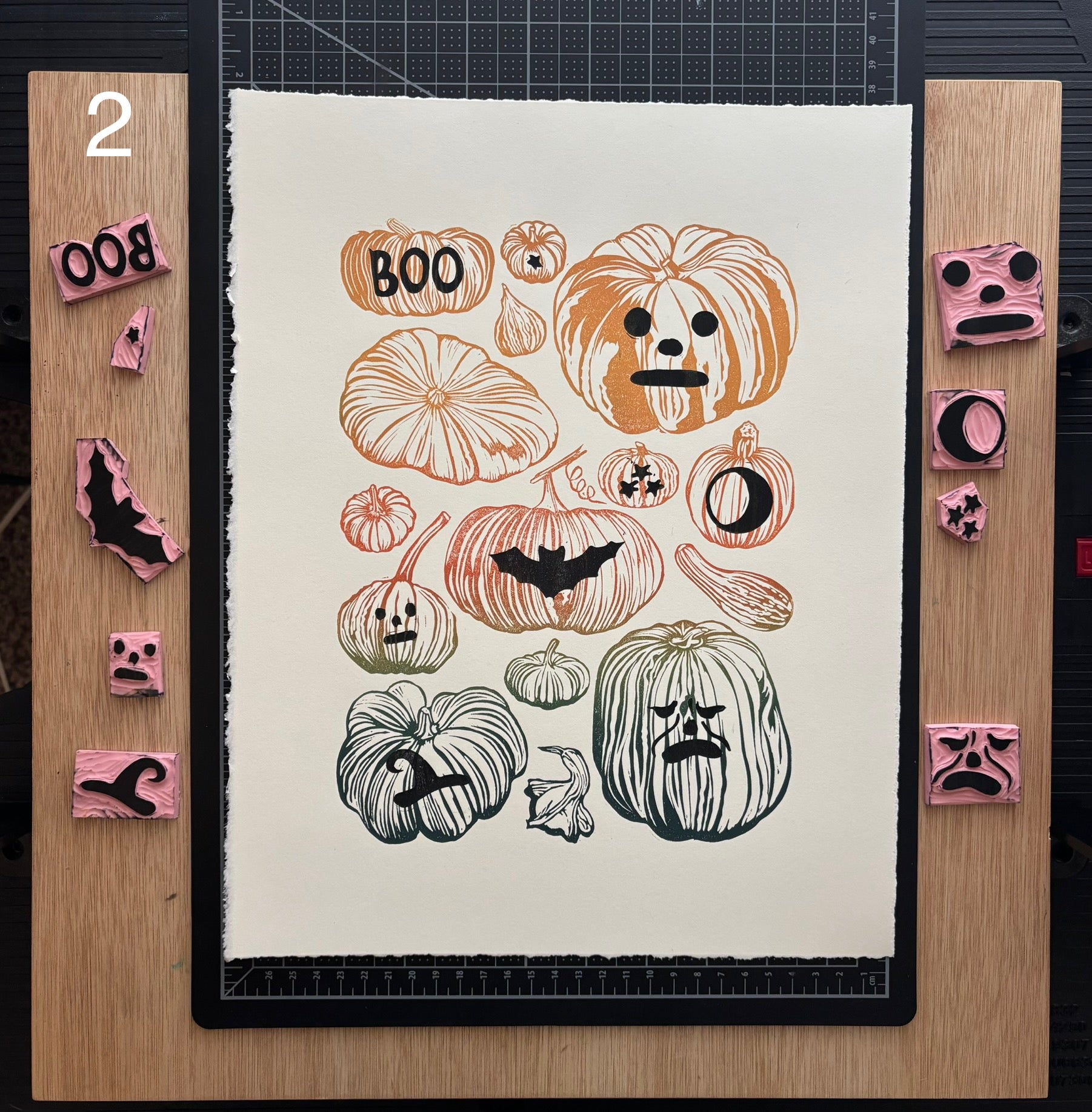 This is an 11x14 linocut print of pumpkins and Jack-o-lanterns.